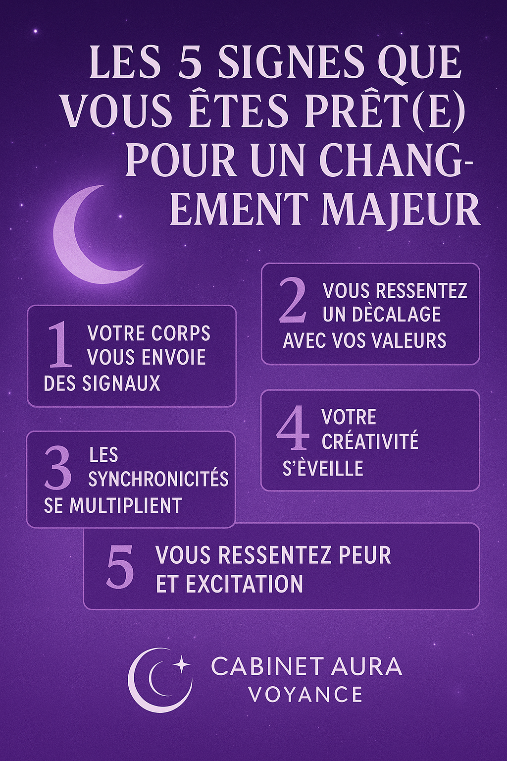 Parfois, la vie nous murmure qu'il est temps de tourner une page. D'autres fois, elle nous le crie. Au Cabinet Aura Voyance, nous accompagnons quotidiennement des personnes qui se trouvent à ce moment précis où leur existence s'apprête à prendre un virage important. Voici les 5 signes qui indiquent clairement que vous êtes prêt(e) pour un changement majeur dans votre vie.